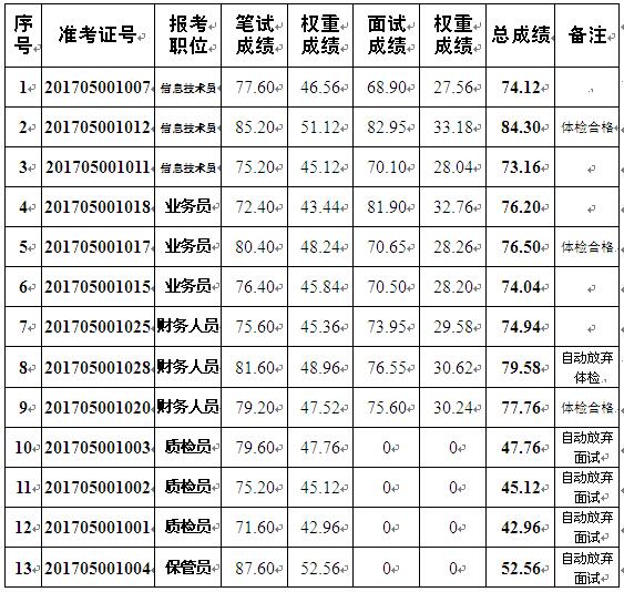 惠州市儲(chǔ)備軍糧供應(yīng)公司公開招聘員工筆試、面試、體檢工作已結(jié)束。現(xiàn)將進(jìn)入面試環(huán)節(jié)的考生總成績(jī)(總成績(jī)=筆試成績(jī)×60%+面試成績(jī)×40%)、體檢結(jié)果予以公示。